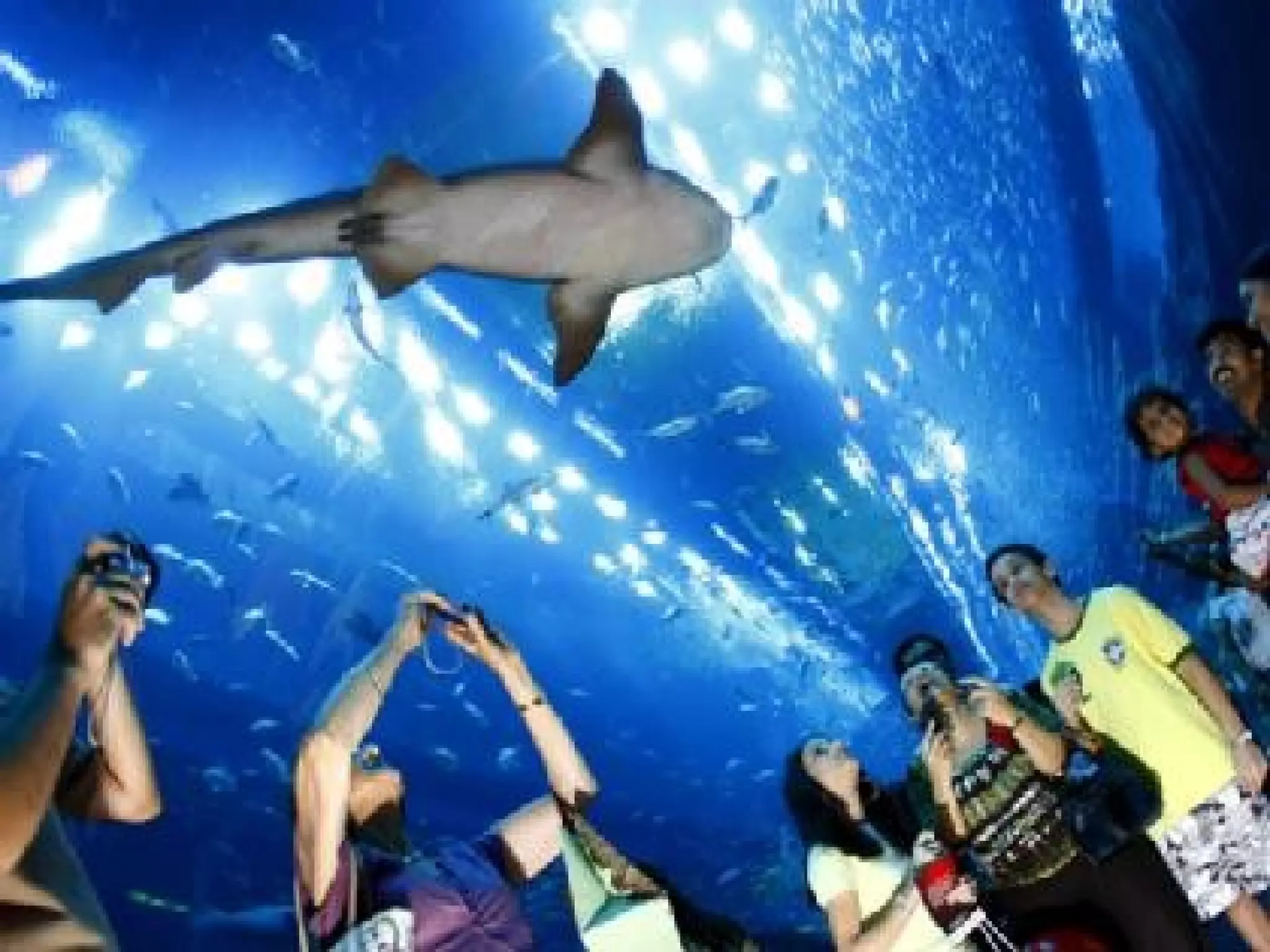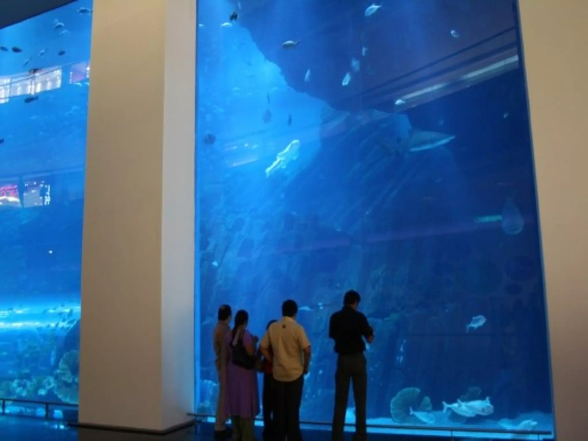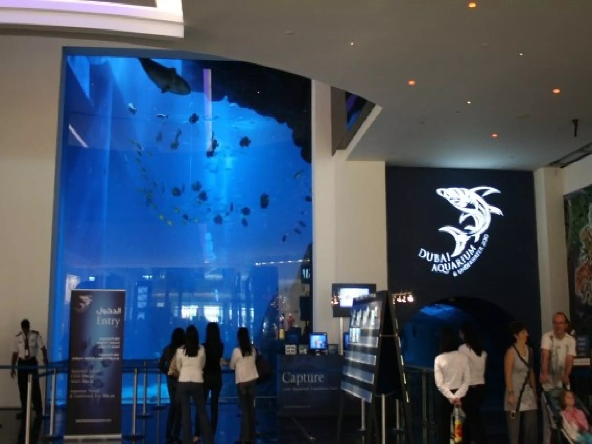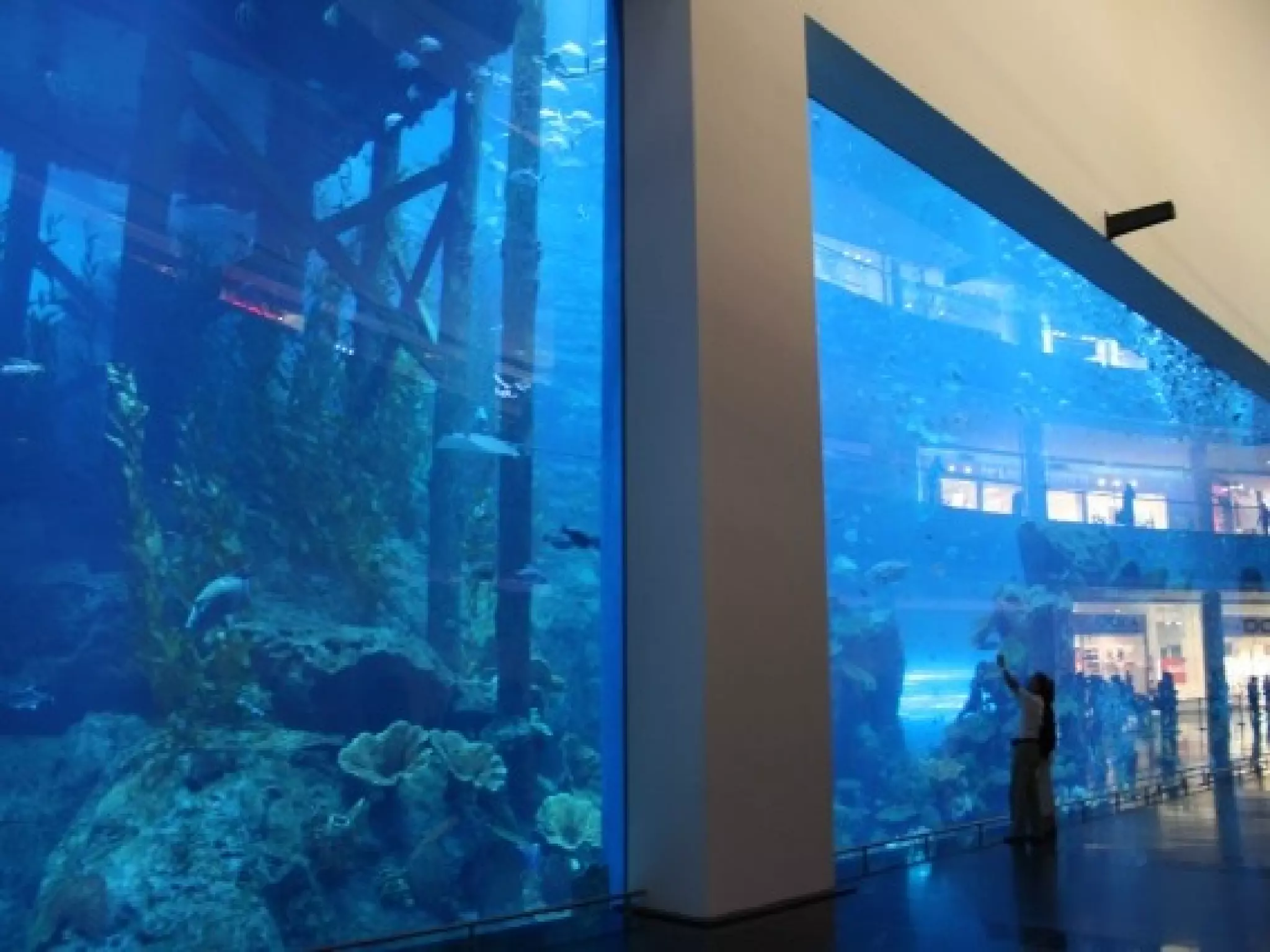 O documento descreve o aquário gigante de Dubai, que inclui galerias de lojas, hotéis e restaurantes, com detalhes sobre o hall de entrada, os tubos dentro do aquário, patinação olímpica, telas gigantes, boutiques do centro comercial, hotéis e um delphinarium, com espetáculos de som e luz à noite.