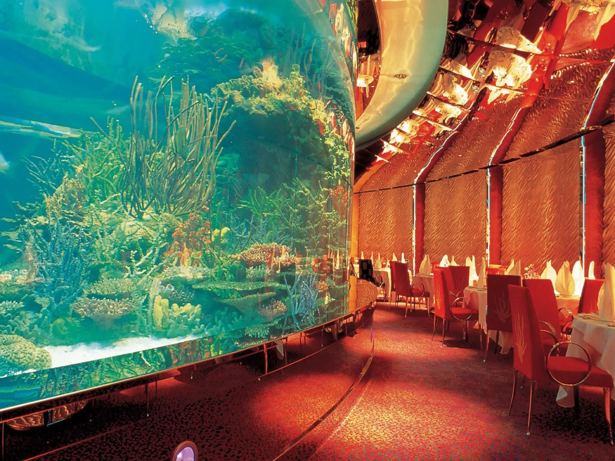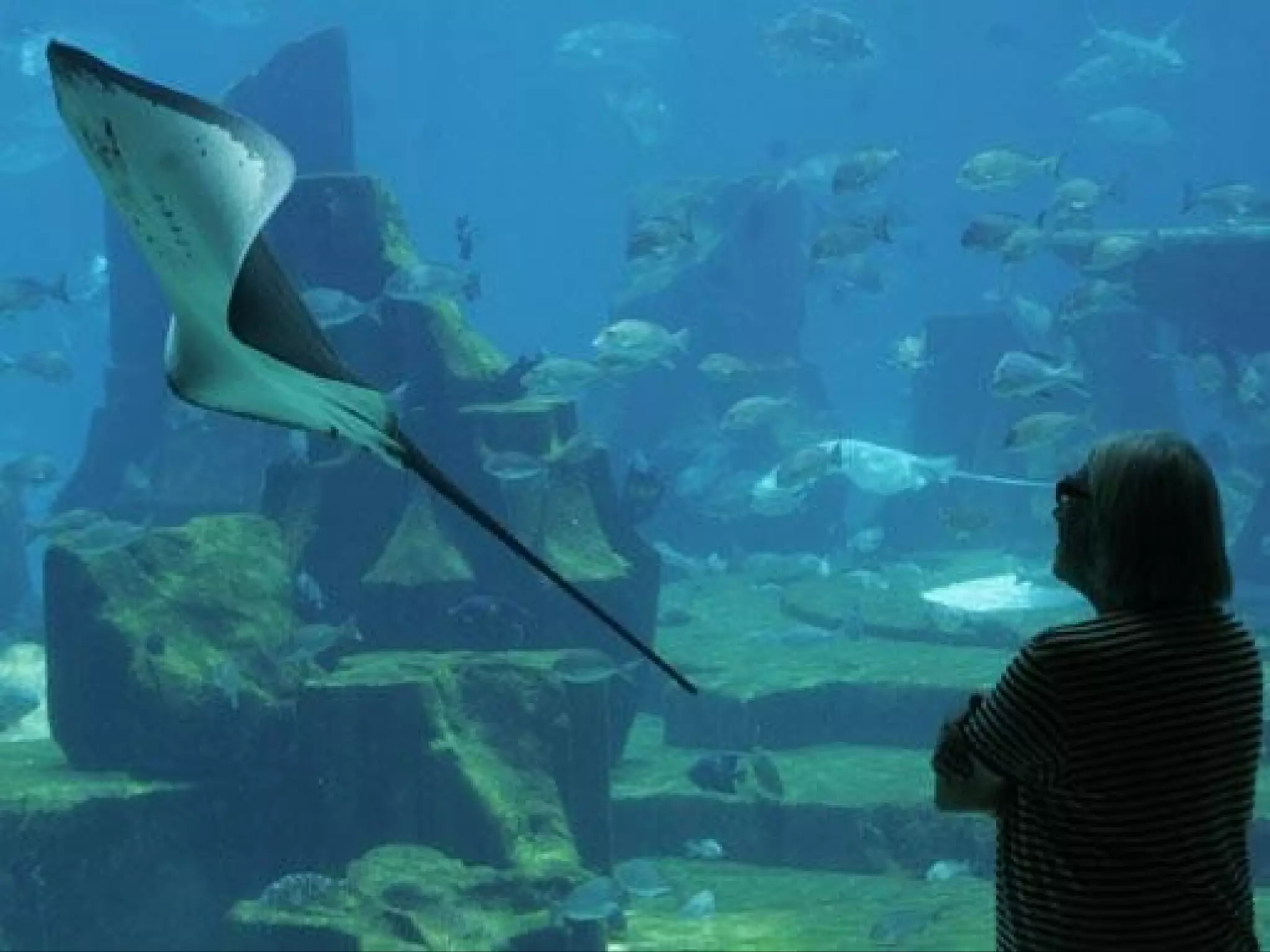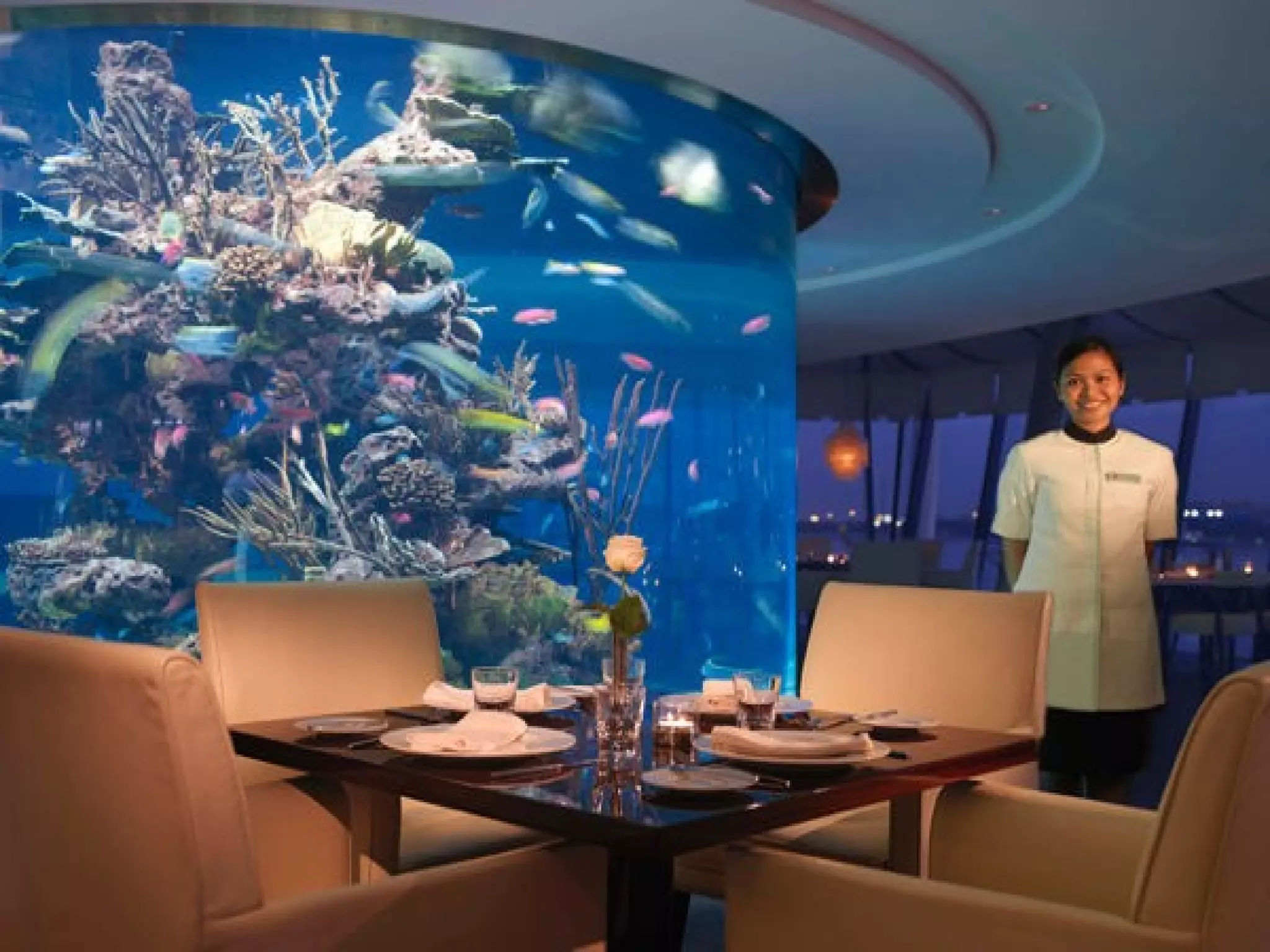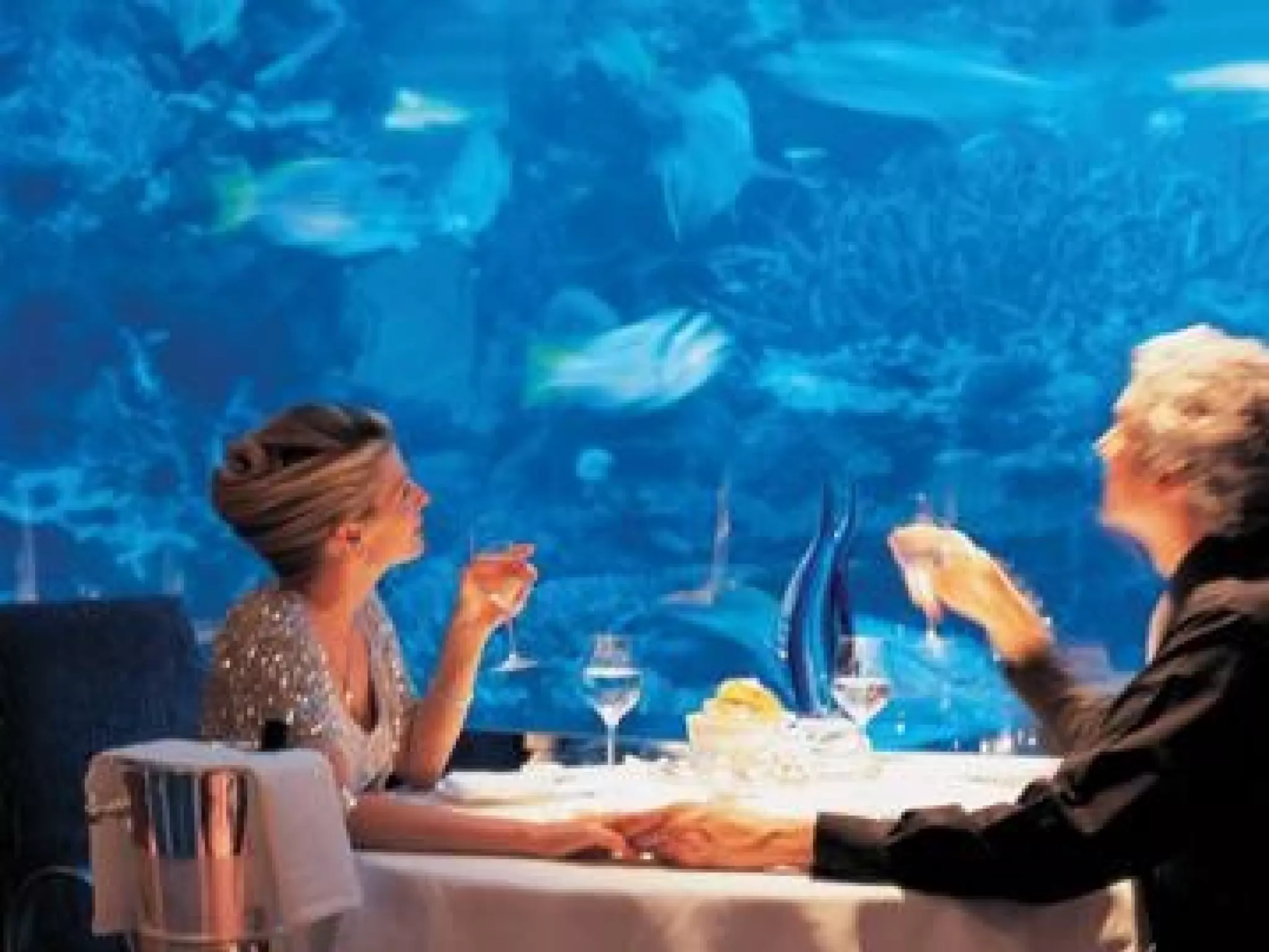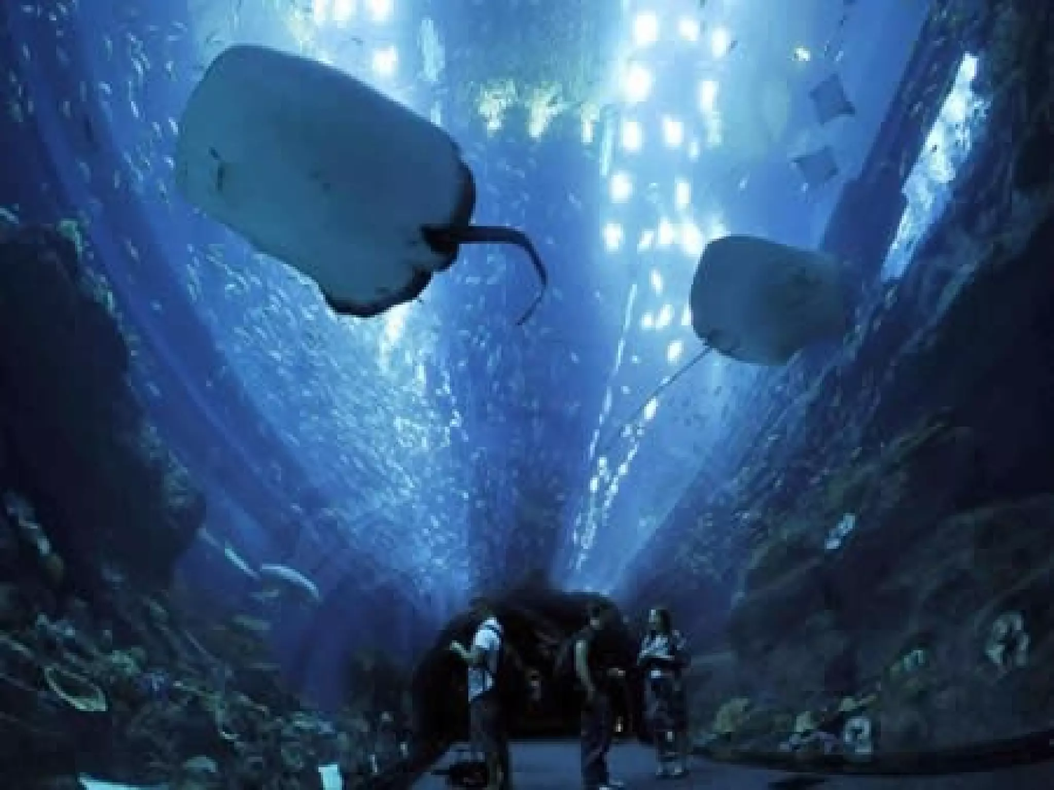 O documento descreve o aquário gigante de Dubai, que inclui galerias de lojas, hotéis e restaurantes, com detalhes sobre o hall de entrada, os tubos dentro do aquário, patinação olímpica, telas gigantes, boutiques do centro comercial, hotéis e um delphinarium, com espetáculos de som e luz à noite.