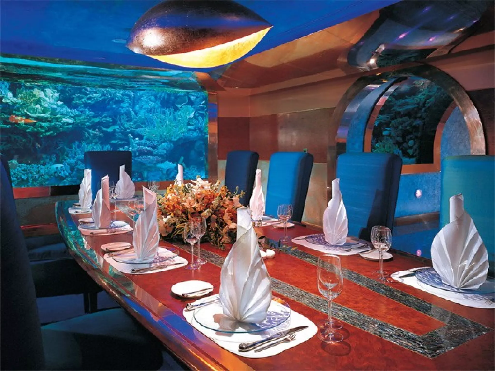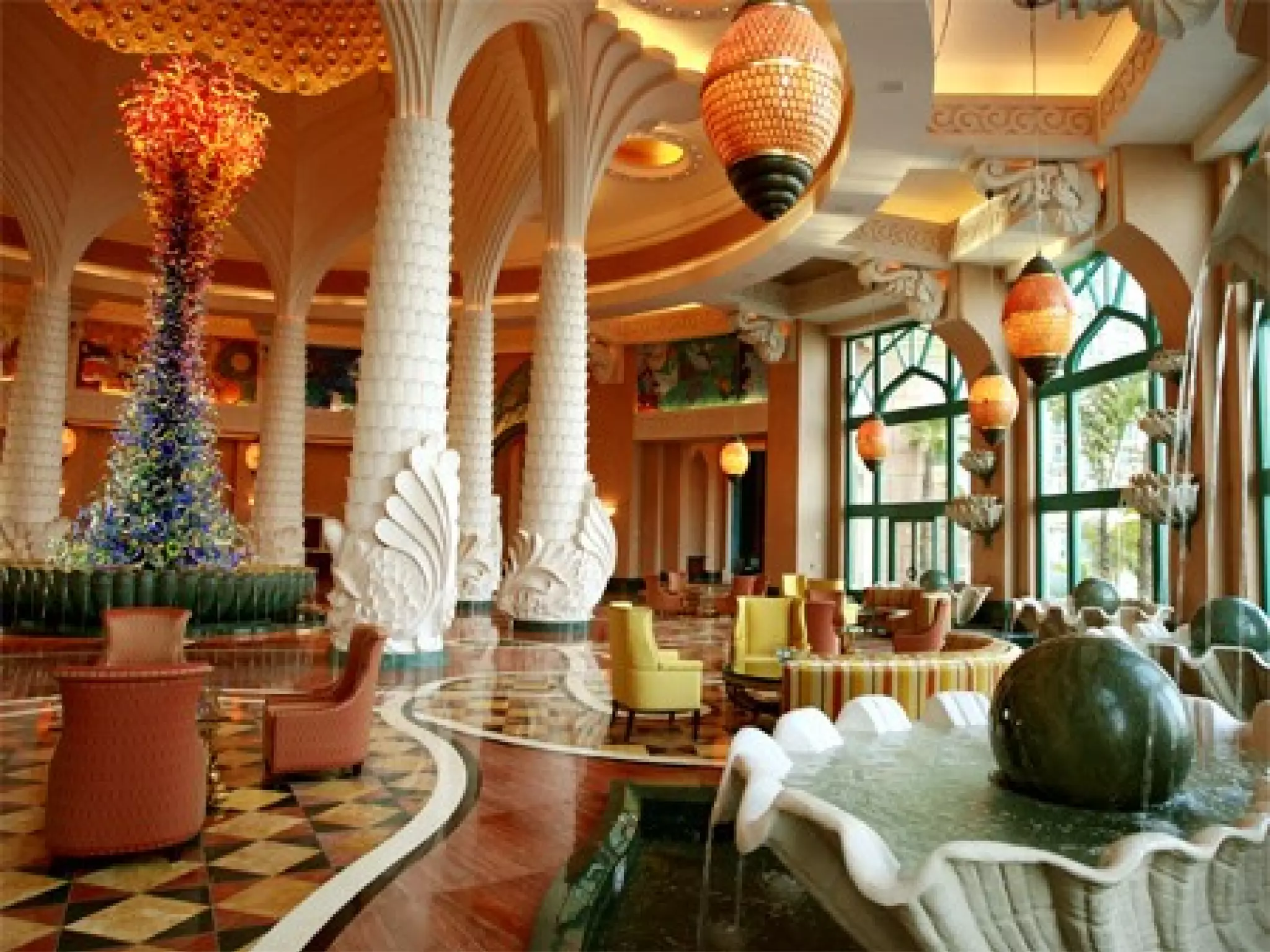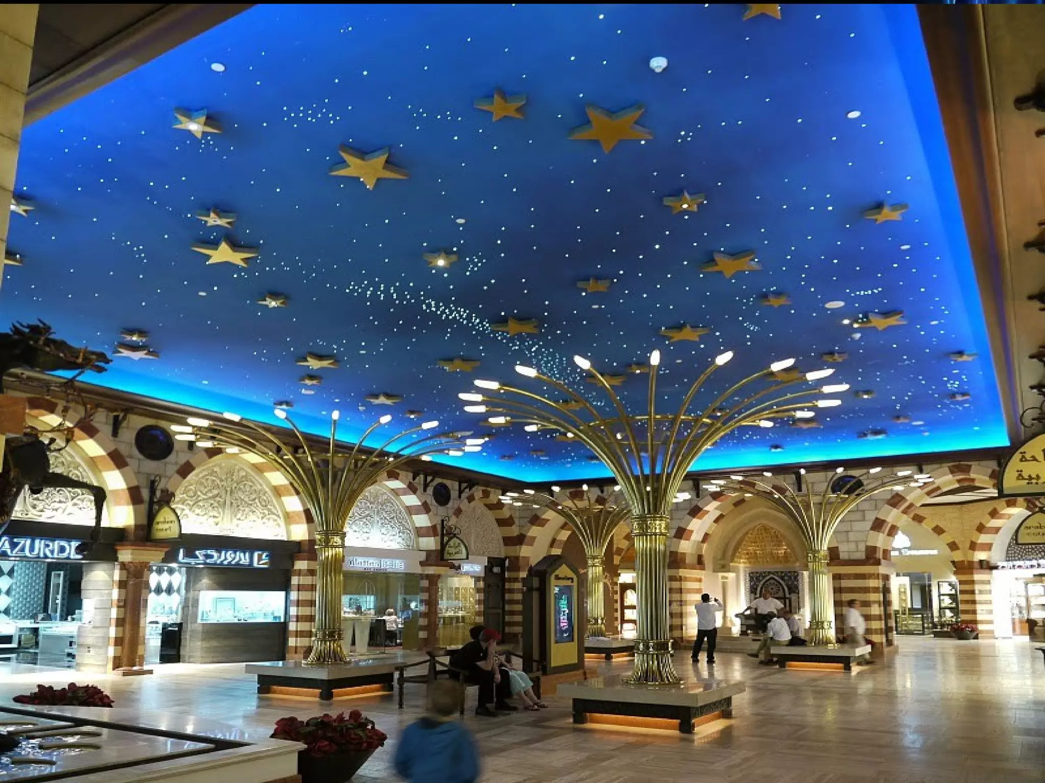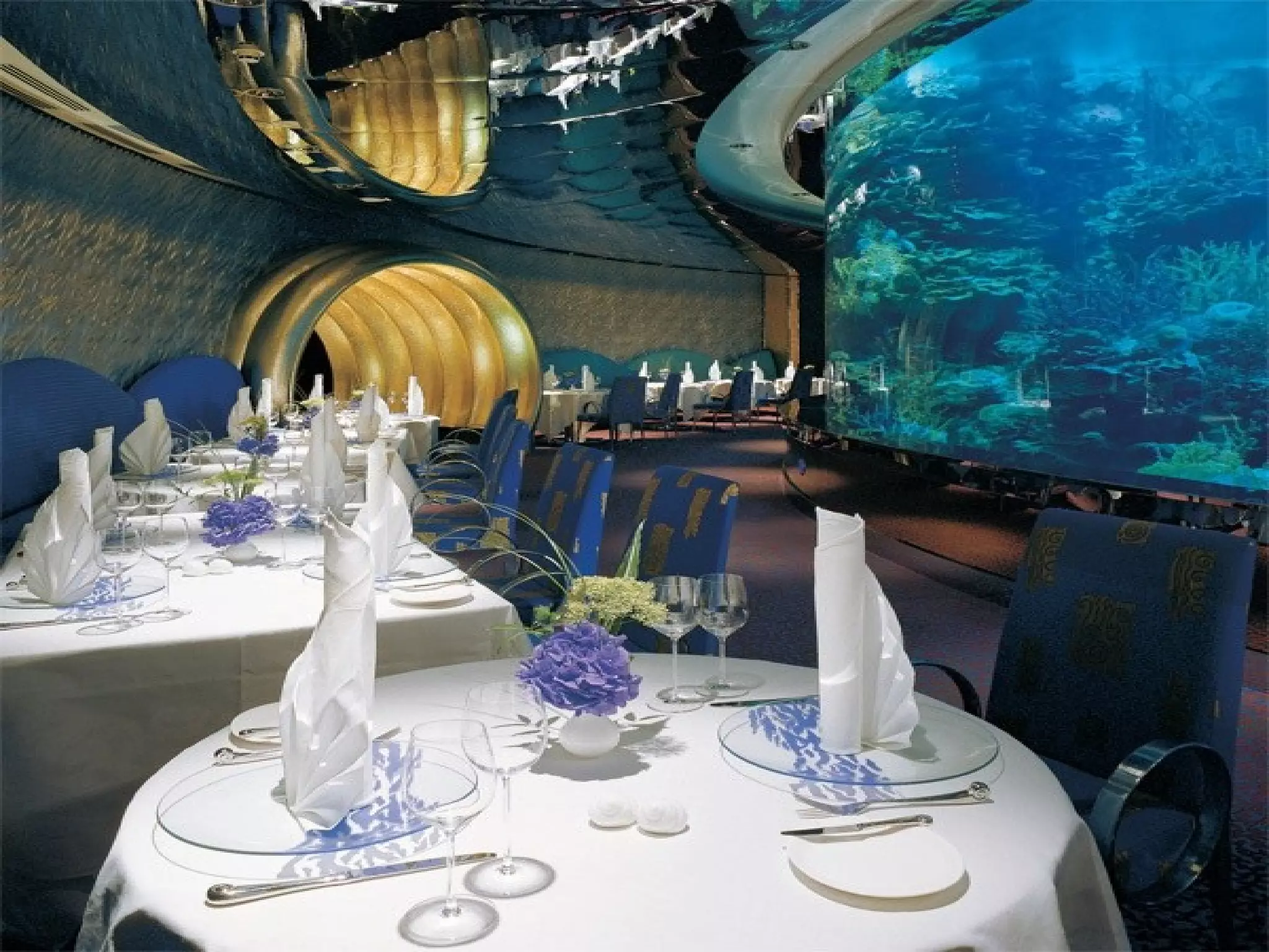 O documento descreve o aquário gigante de Dubai, que inclui galerias de lojas, hotéis e restaurantes, com detalhes sobre o hall de entrada, os tubos dentro do aquário, patinação olímpica, telas gigantes, boutiques do centro comercial, hotéis e um delphinarium, com espetáculos de som e luz à noite.