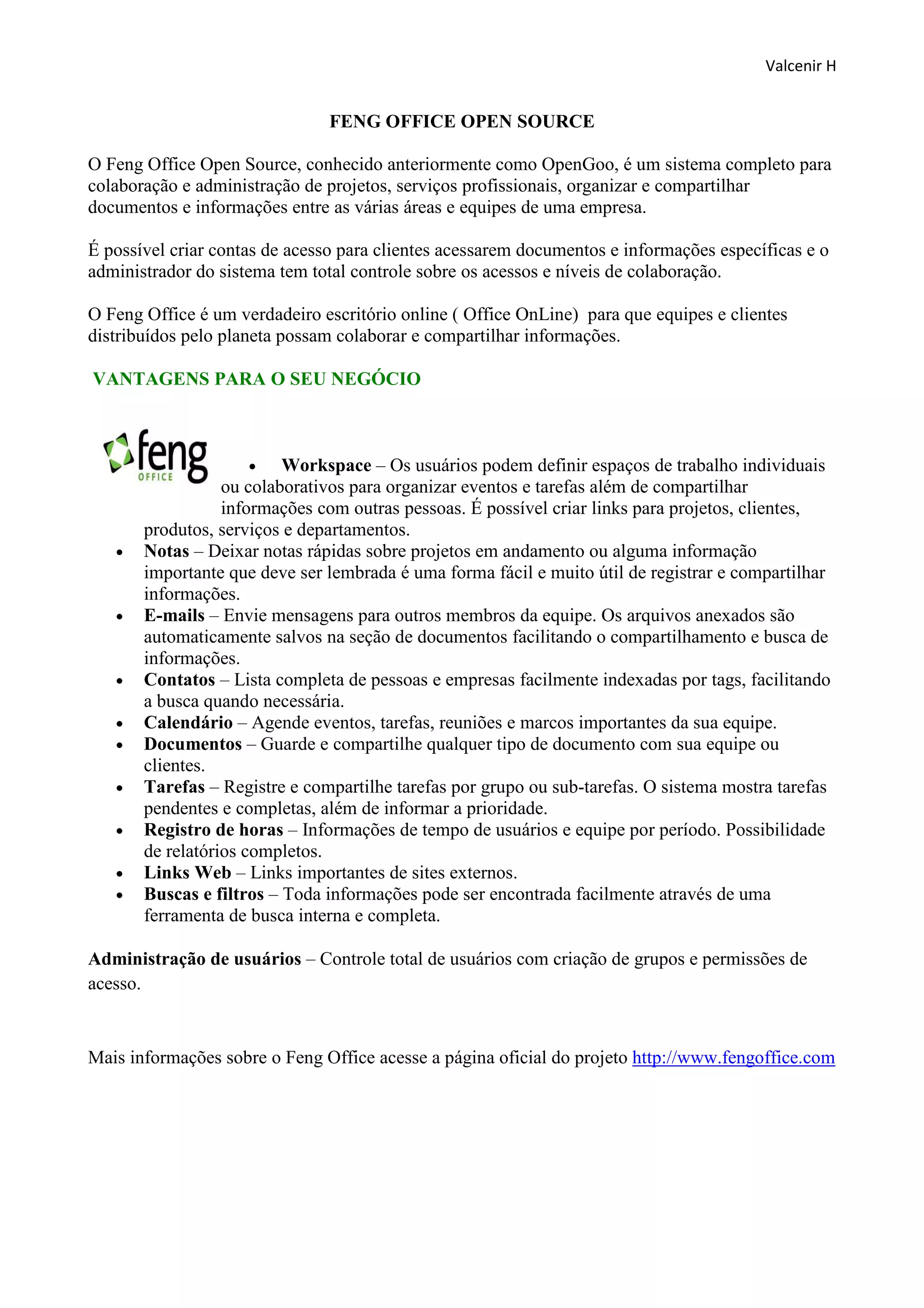 O Feng Office é um sistema de colaboração online que permite criar contas para clientes acessarem documentos, organizar informações em espaços de trabalho e compartilhar arquivos, notas, e-mails e tarefas entre equipes. O documento fornece instruções para instalação no Debian e lista recursos como calendário, registro de horas e busca de dados.