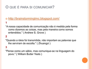 O documento discute a evolução da comunicação humana através das eras dos símbolos, da fala, da escrita, da impressão e da informação. Também aborda conceitos como canal, contexto, ruído, feedback, redundância e entropia no processo de comunicação, além de distinguir comunicação e informação. Por fim, apresenta uma perspectiva histórica da comunicação educacional de acordo com Jean-Cloutier.