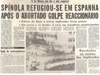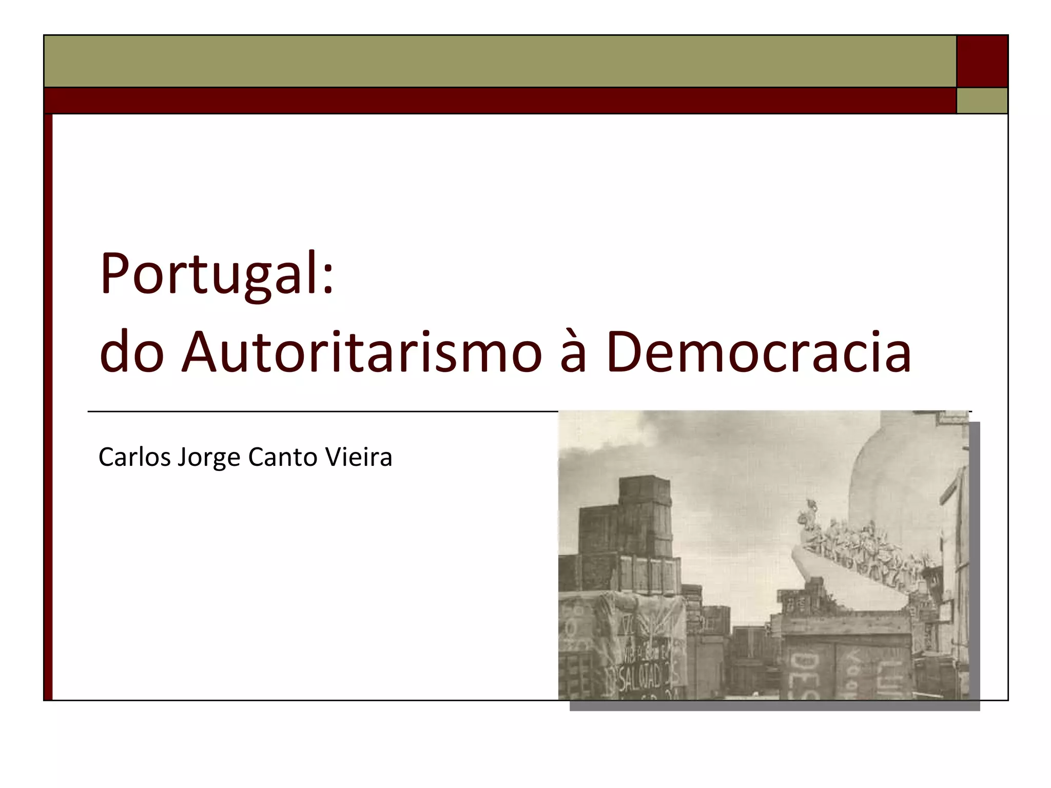 O documento descreve a história de Portugal desde o regime autoritário de Salazar até a democratização do país. Resume a guerra colonial em Angola, Guiné-Bissau e Moçambique na década de 1960, a Revolução dos Cravos de 1974 que derrubou o regime, e o processo de independência das antigas colônias nos anos seguintes.