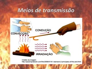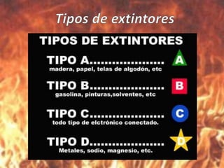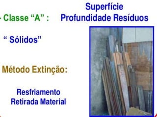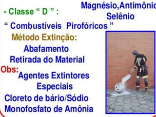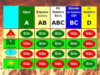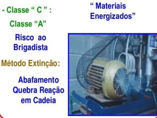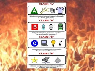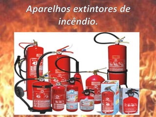 O documento discute os tipos de incêndio, agentes extintores e equipamentos de proteção contra incêndio. Explica o que é fogo, como se propaga e como pode ser extinto, listando cuidados importantes para situações de emergência.