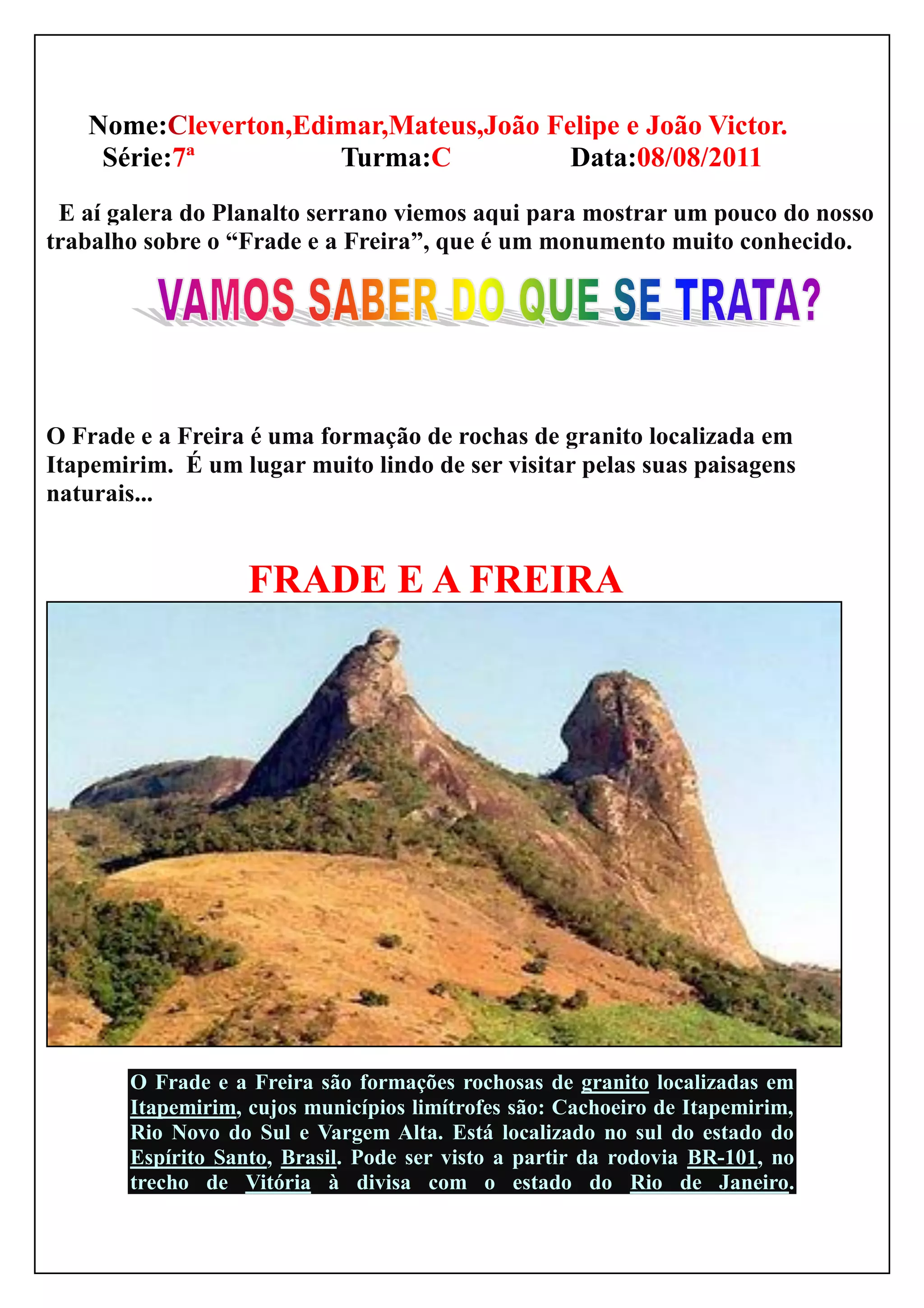 O documento descreve o Frade e a Freira, uma formação rochosa localizada em Itapemirim, Espírito Santo. O Frade e a Freira são duas rochas que lembram um frade e uma freira e deram origem a uma lenda de amor proibido. Atualmente, o local é um monumento natural que atrai turistas pela beleza de suas paisagens naturais.