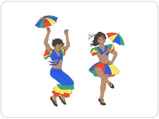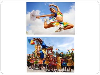 O documento descreve a origem e características do frevo, dança típica de Pernambuco que surgiu no final do século XIX a partir de elementos de capoeira, balé e danças cossacas. O frevo é uma dança complexa que utiliza uma sombrinha colorida e possui passos básicos como dobradiça, tesoura e locomotiva. O vestuário do frevo é de cores vivas e estampados.