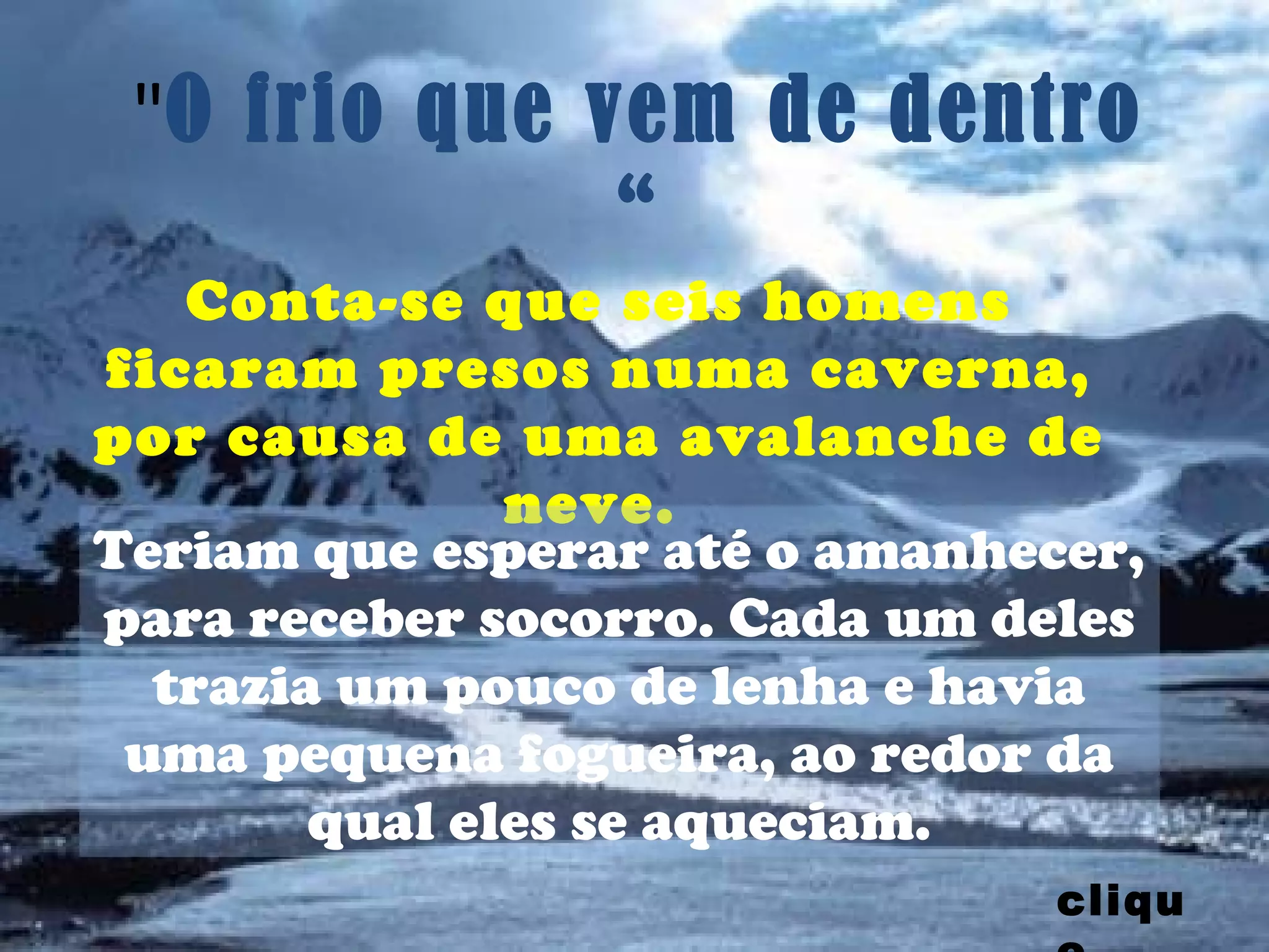 Seis homens ficaram presos em uma caverna durante uma avalanche. Cada um levou lenha para alimentar uma fogueira, mas por motivos egoístas e preconceituosos nenhum deles colocou sua lenha no fogo quando este começou a se apagar, resultando na morte congelada de todos.