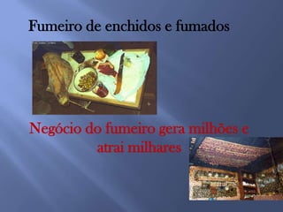 Este documento constitui o plano de negócios para uma empresa de fumeiro chamada Fumeirinho da Vila. O plano descreve a localização da empresa, os investimentos necessários, os produtos que serão vendidos e as projeções de lucro esperadas.