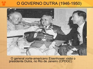 O governo Dutra (1946-1950) promulgou a Constituição de 1946, abriu a economia brasileira e apoiou os Estados Unidos na Guerra Fria, rompendo com a União Soviética e fechando o Partido Comunista Brasileiro. A política de Dutra também estabeleceu o Plano SALTE e reduziu o poder aquisitivo dos salários durante seu mandato.