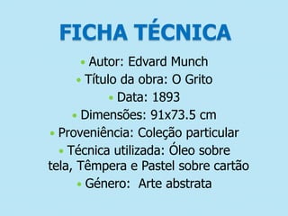 O documento descreve a obra "O Grito" do artista Edvard Munch. A obra retrata uma figura andrógena em profunda angústia e desespero existencial em frente a um céu avermelhado e um rio azul. A obra reflete a vida pessoal angustiante de Munch e busca expressar os sentimentos universais de dor e solidão.