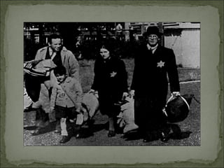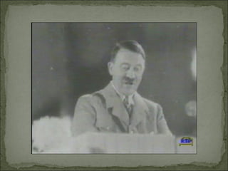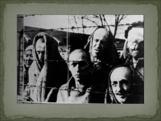 O documento descreve os horrores dos campos de concentração nazis, onde milhões de pessoas foram mortas ou submetidas a trabalhos forçados e experimentos médicos. Hitler defendia o uso do terror para subjugar a população e os campos eram usados para eliminar os considerados inimigos da raça ariana, incluindo judeus, ciganos e opositores políticos. Auschwitz tinha capacidade para matar mais de 20 mil pessoas por dia em câmaras de gás.