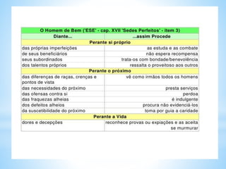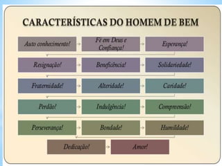 1. O documento lista qualidades como confiança, esperança, beneficência, solidariedade e fraternidade que conduzem ao homem de bem.