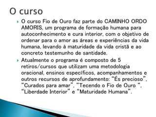 O documento descreve o programa 'caminho ordo amoris', que visa o autoconhecimento e cura interior por meio de cursos e retiros voltados à maturidade cristã. Enfatiza a importância do acompanhamento espiritual, sacrifício e aceitação do sofrimento como parte do crescimento pessoal. O texto também aborda a misericórdia de Deus e a necessidade de transformar experiências dolorosas em oportunidades de amor e reconciliação.