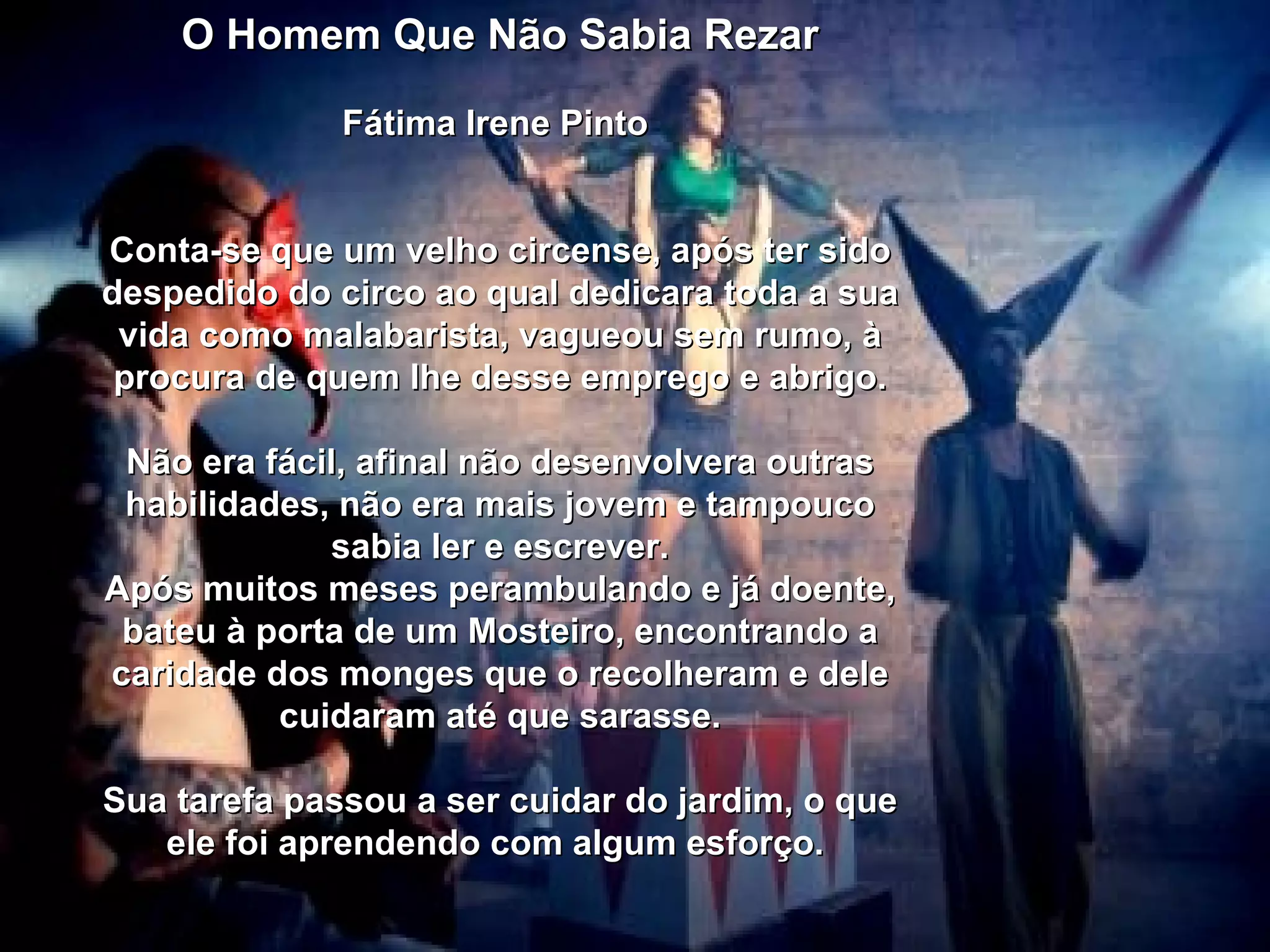 Um velho circense sem emprego é acolhido em um mosteiro. Ele se sente triste por não poder acompanhar as orações dos monges, já que não sabe ler. Um dia, faz sua oração de forma única, com seus malabarismos diante da imagem de Jesus. Os monges presenciam Jesus enxugando o suor do homem, mostrando que ele rezara com o coração.