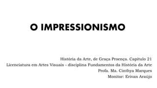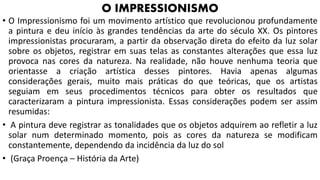 O impressionismo foi um movimento artístico que revolucionou a pintura, focando na representação das mudanças de luz e cor na natureza sem seguir teorias rígidas. Artistas como Monet, Renoir e Degas exploraram diferentes aspectos da luz e da forma, com Monet se destacando na captura da luz solar e Renoir expressando otimismo na vida parisiense. A técnica do pontilhismo, desenvolvida por Seurat e Signac, aprofundou as pesquisas sobre percepção óptica, utilizando pontos de cor para criar imagens integradas.