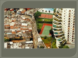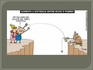 O documento discute a desigualdade de renda global com base no Coeficiente de Gini e fornece estatísticas de vários países. Ele também critica a passividade diante da desigualdade e defende a mudança de atitude para construir um futuro melhor.