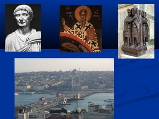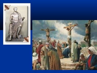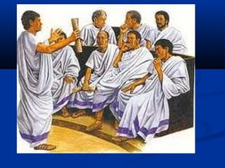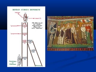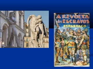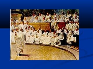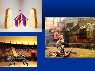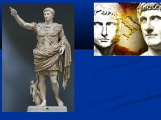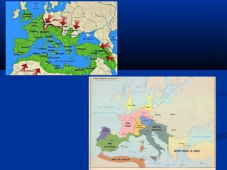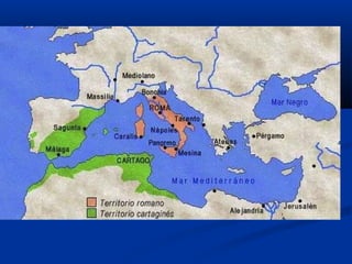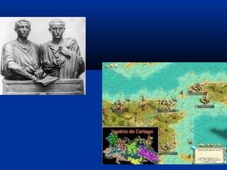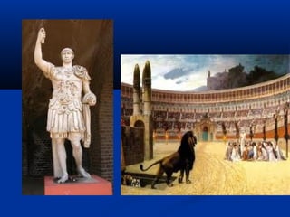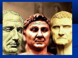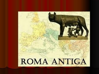 O documento descreve a localização e a evolução da sociedade e da política do Império Romano. Começando em Roma, os latinos e etruscos estabeleceram as bases iniciais. A sociedade romana era dividida em patrícios, clientes, plebeus e escravos. Ao longo do tempo, os plebeus conquistaram mais direitos através de revoltas. Politicamente, Roma evoluiu de uma monarquia para uma república, e eventualmente um império sob o domínio de Júlio César.