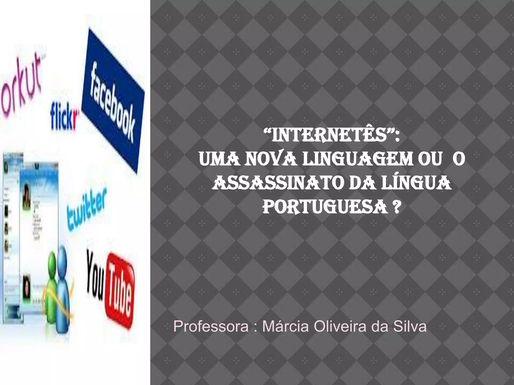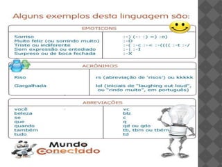 O documento discute o "internetês", uma linguagem utilizada na internet, caracterizada por abreviações e formas não convencionais de se expressar. Apesar de ser uma prática comum entre adolescentes para agilizar conversas online, alguns acreditam que pode ameaçar a língua portuguesa. O texto também explica elementos comuns dessa linguagem, como emoticons e risadas onomatopaicas.