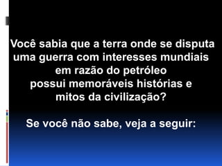O documento descreve a importância histórica e bíblica do Iraque, mencionando que a Mesopotâmia, onde hoje é o Iraque, foi o berço da civilização e cena de muitos eventos bíblicos, como a história de Noé e a Torre de Babel. Além disso, o Iraque é o segundo país mais mencionado na Bíblia, depois de Israel.
