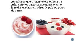 O documento discute como o iogurte é feito com leite e bactérias benéficas, e como essas bactérias transformam o açúcar no leite em ácido lático durante o processo de fermentação. Também descreve alguns benefícios do iogurte para a saúde, incluindo ajudar na digestão, reduzir o mau hálito, e ser uma boa fonte de cálcio e vitaminas.