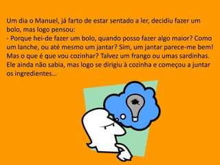 O Manuel decide fazer um jantar para a família com várias comidas como pizzas, sardinhas, salsichas, frango, puré de batatas e sushi cortado como no Japão. Ele compra os ingredientes e prepara tudo, incluindo um comboio de brincar para servir os molhos. A família chega e todos ficam impressionados com o jantar, comendo e se divertindo até o comboio explodir de molho.