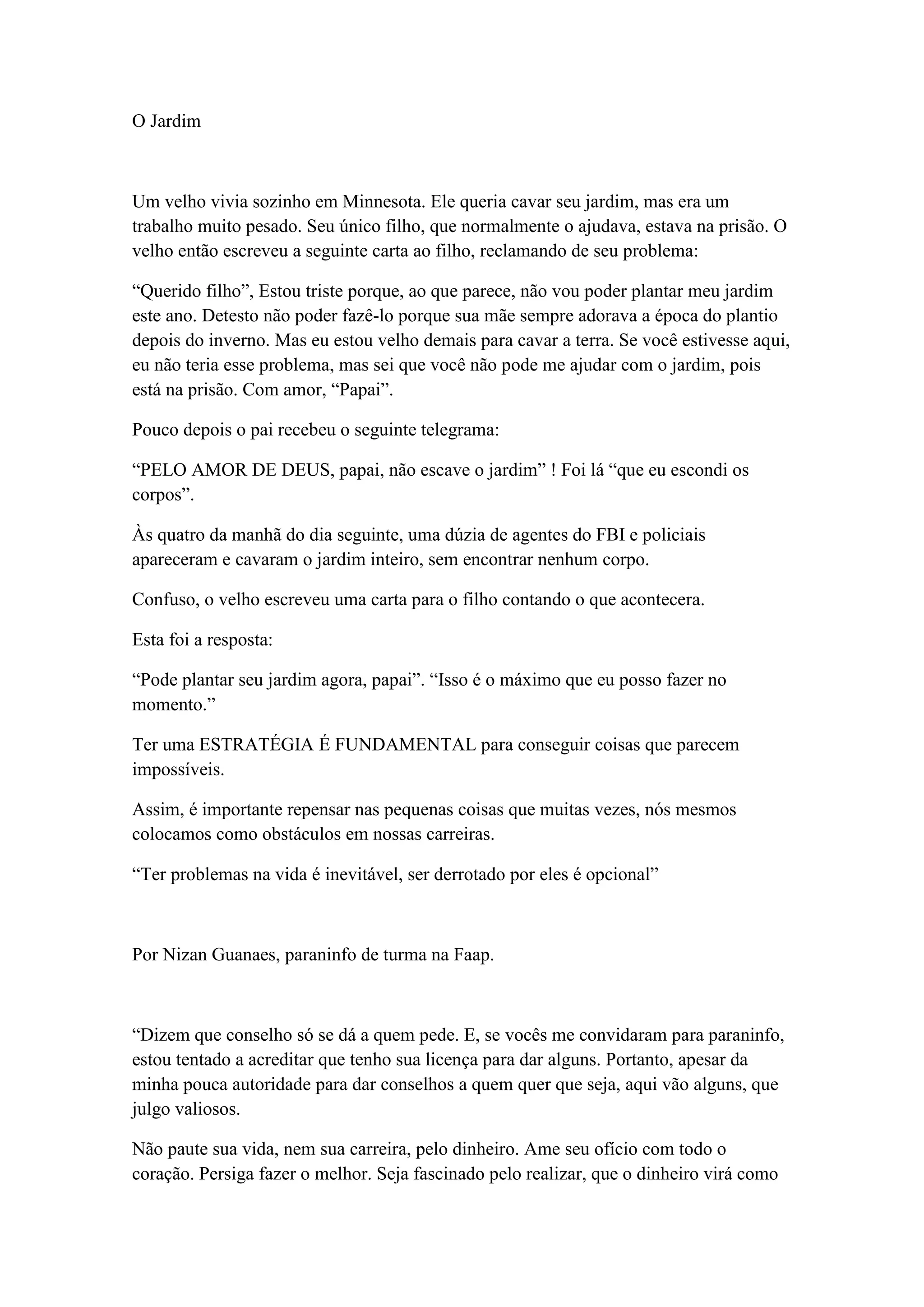 1) Um velho queria cavar seu jardim, mas era muito pesado para ele. Seu filho na prisão disse para não cavar o jardim, pois escondeu corpos lá.