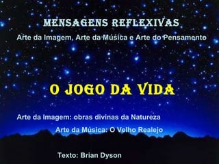 O documento resume uma palestra de Brian Dyson, ex-presidente da Coca-Cola, sobre viver a vida como um jogo de equilíbrio entre trabalho, família, saúde, amigos e espírito. Ele enfatiza a importância de não se comparar com os outros, seguir os próprios objetivos, valorizar o que é importante para cada um e viver cada dia de cada vez.