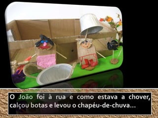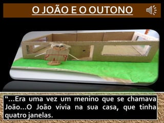 O texto descreve a estação do outono, incluindo as árvores perdendo suas folhas amarelas, laranjas e vermelhas, algumas mantendo folhas verdes. Fala também sobre nuvens cinzentas, chuva, a vindima e as andorinhas voando para o sul. No final, crianças criaram uma história e apresentação sobre o João e o outono usando materiais recicláveis.