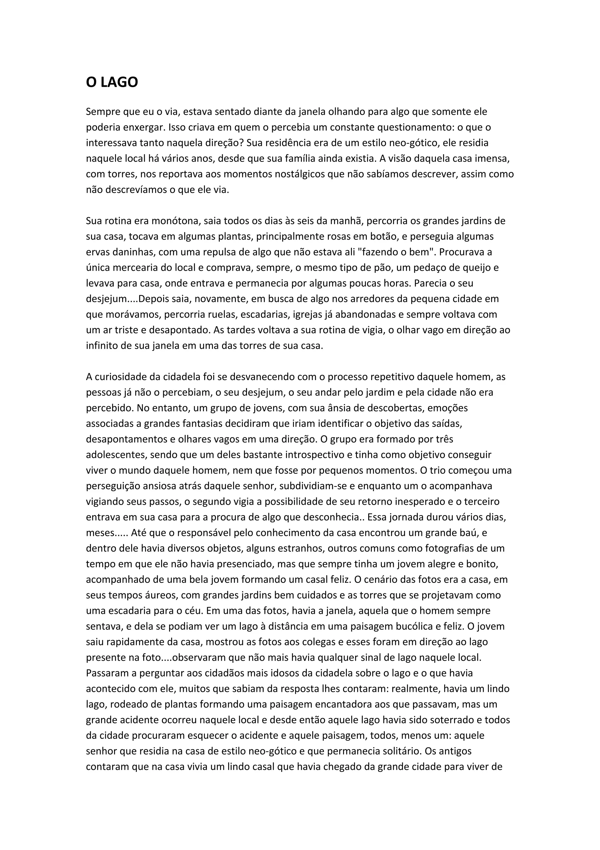 Um senhor vivia sozinho em uma grande casa neo-gótica, passando as tardes olhando fixamente para um determinado ponto no horizonte. Um grupo de adolescentes decidiu investigar o motivo desse comportamento e descobriu que, anos atrás, havia um lago no local para o qual o senhor olhava, onde sua esposa havia sido morta por um crocodilo enquanto tomava banho.