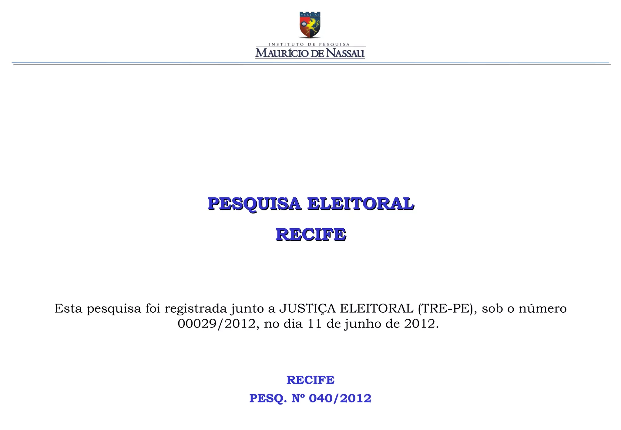 Este resumo descreve os principais pontos de uma pesquisa eleitoral realizada em Recife entre 11 e 12 de junho de 2012. A pesquisa entrevistou 816 pessoas e teve margem de erro de 3,5 pontos percentuais. O documento apresenta os resultados das perguntas sobre intenção de voto, avaliação de políticos e obras públicas.