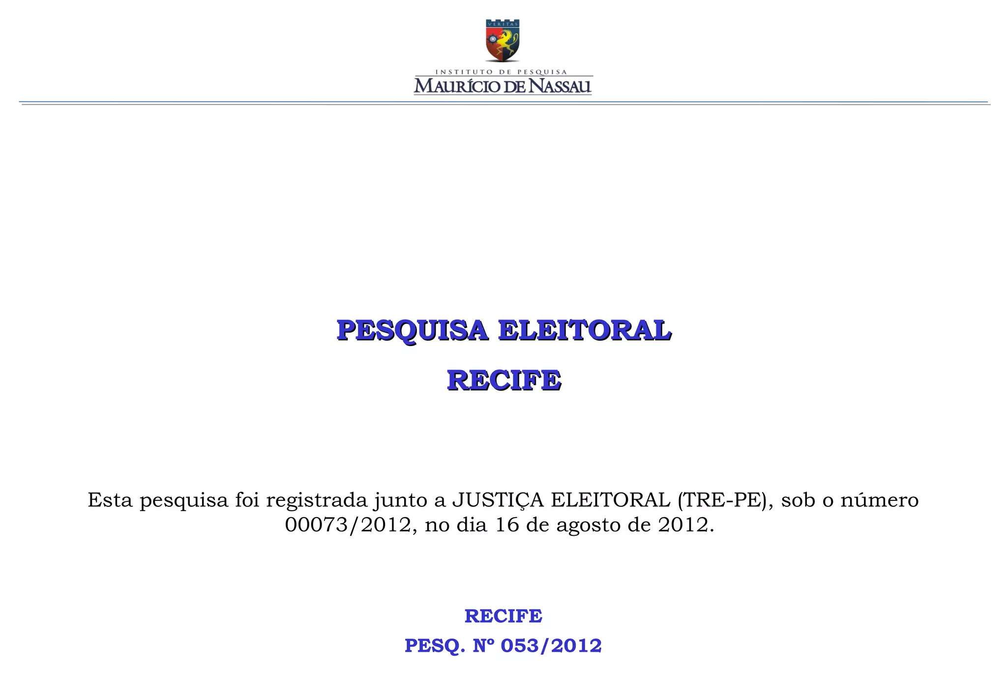 Este documento apresenta os resultados de uma pesquisa eleitoral realizada em Recife entre os dias 20 e 21 de agosto de 2012 com 1080 entrevistados. A pesquisa investigou as intenções de voto para prefeito, a avaliação dos principais candidatos e autoridades, e as opiniões dos entrevistados sobre problemas e temas locais.
