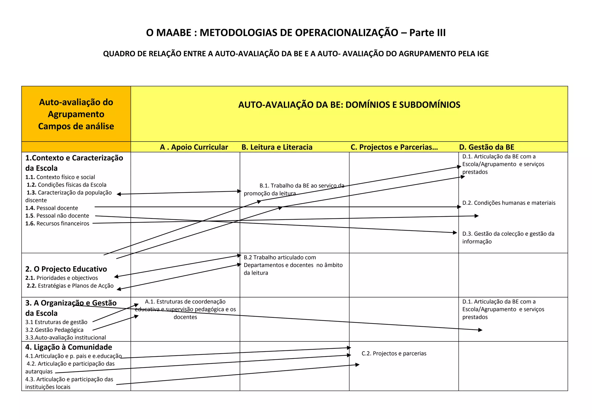 Este documento apresenta uma tabela de relação entre a auto-avaliação da Biblioteca Escolar (BE) e a auto-avaliação do Agrupamento. A tabela relaciona os domínios e subdomínios da auto-avaliação da BE com os campos de análise da auto-avaliação do Agrupamento, fornecendo uma estrutura para analisar como a BE contribui para diferentes áreas da escola.