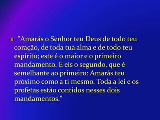 Este documento apresenta os dois principais mandamentos segundo o Evangelho de Mateus: amar a Deus sobre todas as coisas e amar o próximo como a si mesmo. Toda a lei e os profetas estão contidos nestes dois mandamentos de amor a Deus e ao próximo.