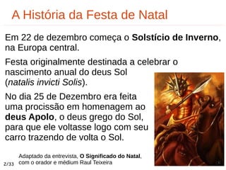 O documento explora a origem e o significado do Natal, destacando sua transformação de uma celebração pagã para a comemoração do nascimento de Jesus no século III, após a adoção do cristianismo pelo Imperador Constantino. Além disso, enfatiza a importância espiritual do Natal e a necessidade de refletir sobre a humildade e o amor ao próximo, inspirando os indivíduos a se autodesenvolverem durante essa época. Também menciona tradições e práticas associadas à festa, assim como a influência de figuras como Raul Teixeira e Divaldo Pereira Franco no entendimento contemporâneo sobre o Natal.