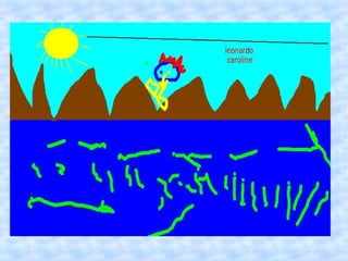 O sol reflete na água do mar onde pessoas estão tomando banho. As algas verdes flutuam na água do mar. O documento descreve uma cena de banhistas na praia com o sol se refletindo na água e algas flutuando na superfície.