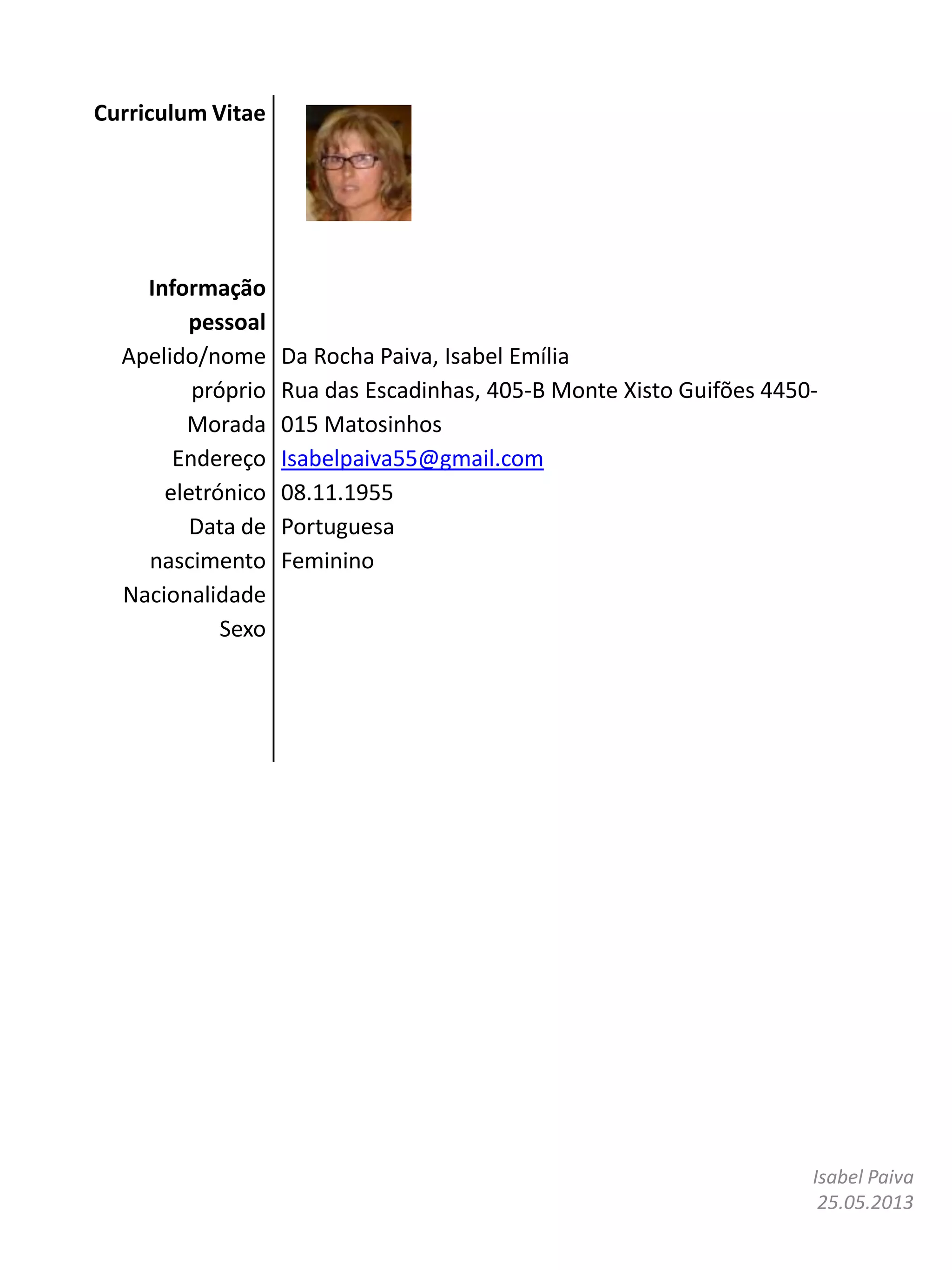 [1] Isabel Paiva apresenta seu currículo com experiência de 1983 a 2011 como chefe de setor de formação em corte e confecção no CITEX. [2] Ela se formou em educação na Universidade Aberta de 2009 a 2012. [3] Sua formação inclui vários cursos profissionais em gestão, informática e produção têxtil.