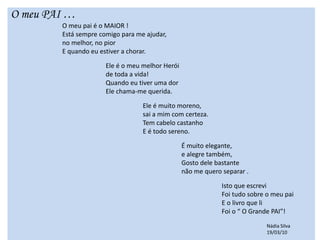 O meu PAI… O meu pai é o MAIOR ! Está sempre comigo para me ajudar, no melhor, no pior E quando eu estiver a chorar. Ele é o meu melhor Herói de toda a vida! Quando eu tiver uma dor Ele chama-me querida. Ele é muito moreno, sai a mim com certeza. Tem cabelo castanho E é todo sereno. É muito elegante, e alegre também, Gosto dele bastante não me quero separar . Isto que escrevi Foi tudo sobre o meu pai E o livro que li Foi o “ O Grande PAI”! Nádia Silva 19/03/10