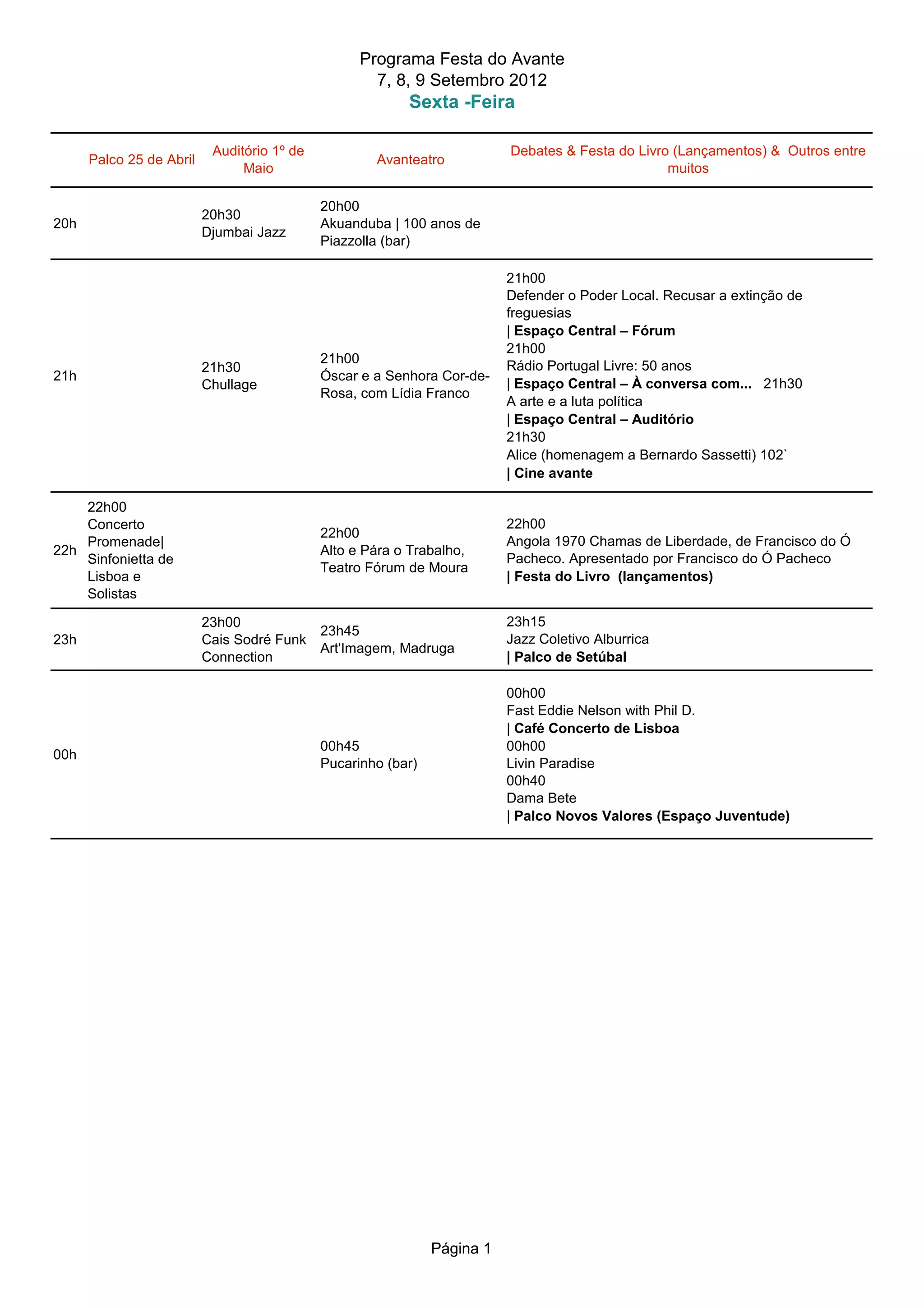 O documento apresenta o programa cultural e político da Festa do Avante entre os dias 7 e 9 de Setembro de 2012. Inclui debates, lançamentos de livros, espetáculos musicais e teatrais em diversos palcos e espaços. Destaca eventos como "Defender o Poder Local" e "Pelo direito à habitação - Não à lei dos despejos" na sexta-feira, e "Código do Trabalho: Combater a ofensiva contra direitos" no sábado.