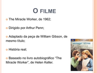 O documento descreve a história real de Anne Sullivan e sua aluna Helen Keller, que ficou cega e surda na infância. Detalha a jornada de Sullivan para ensinar Keller através de sinais táteis e braile, permitindo que Keller aprendesse a se comunicar. Também discute os desafios enfrentados por pessoas com surdocegueira e a importância do apoio educacional para seu desenvolvimento.