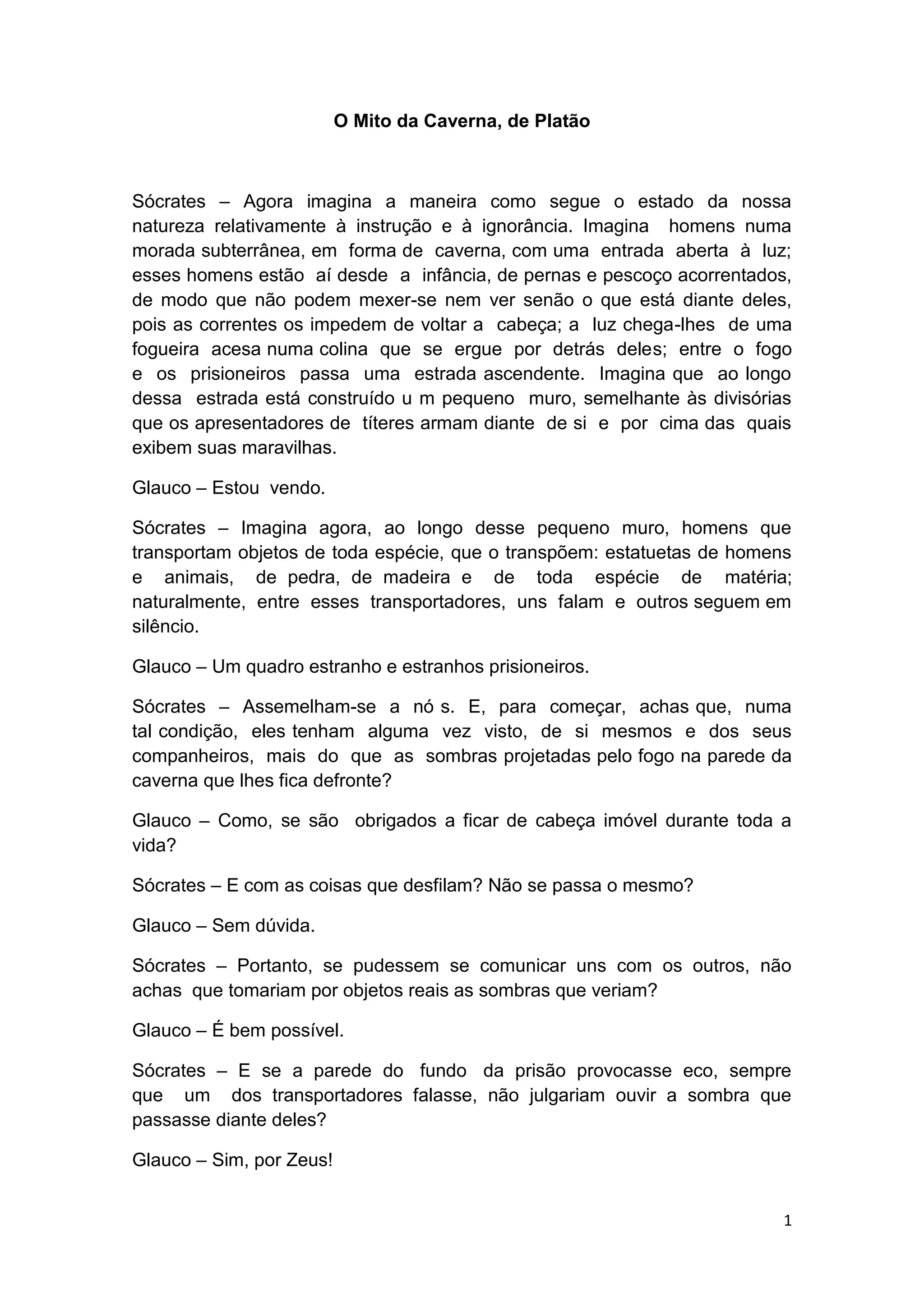 No Mito da Caverna, Platão descreve uma situação onde prisioneiros estão acorrentados em uma caverna desde a infância, vendo apenas sombras projetadas na parede. Isso representa a condição humana de ver apenas o mundo sensível, e não as Ideias verdadeiras. Ao ser libertado, o prisioneiro passa por um processo de adaptação à luz do sol, representando a ascensão da alma ao mundo das Formas. Ao retornar à caverna, ele terá dificuldade de se readaptar e poderá ser morto por tentar