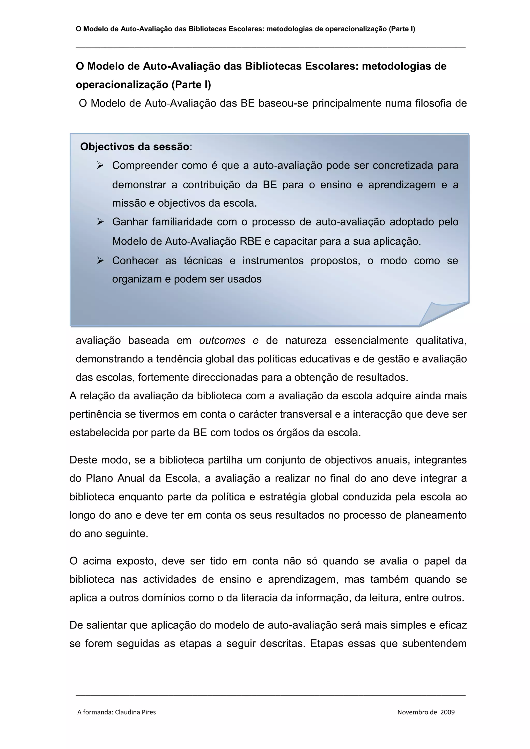Este documento descreve o processo de autoavaliação de bibliotecas escolares utilizando o Modelo de Auto-Avaliação das Bibliotecas Escolares. Ele explica as etapas do processo, como escolher o domínio a ser avaliado, os indicadores e evidências a serem coletados, e como comunicar os resultados para melhorar continuamente o apoio da biblioteca à missão educativa da escola.