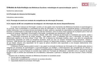 O documento discute a promoção da literacia da informação nas bibliotecas escolares, com foco no 2o ciclo. Propõe um plano de intervenção para desenvolver competências de informação nos alunos através da colaboração entre bibliotecários, professores e recursos diversos, com o objetivo geral de tornar a biblioteca um espaço central para a aprendizagem.