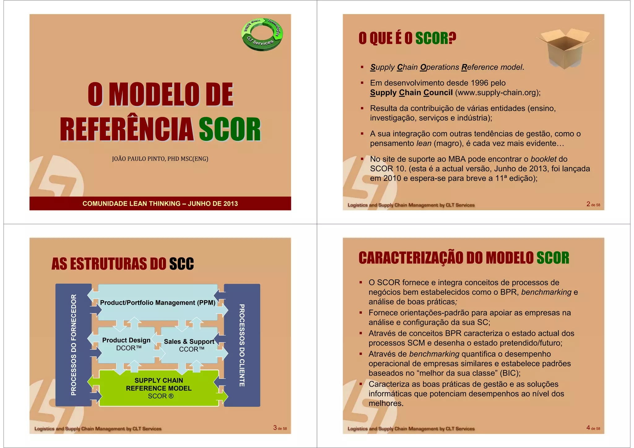 1. O documento apresenta o modelo SCOR (Supply Chain Operations Reference), que fornece padrões para processos de gestão da cadeia de fornecimento, métricas de desempenho e boas práticas.