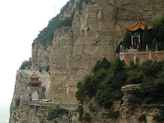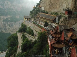O documento descreve uma passagem estreita e longa entre penhascos íngremes com mais de 300 metros de comprimento e 400 degraus de escada levando ao Templo de Zheng Guo.