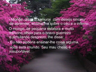 Um samurai violento procura um monge sábio para aprender sobre céu e inferno. O monge provoca o samurai para mostrar-lhe o que é o inferno, arriscando sua vida. Quando o samurai pede perdão, o monge fala sobre o céu. Ambos dependem das escolhas que fazemos diariamente em como lidar com situações.