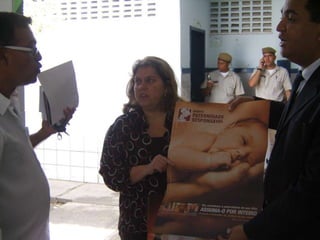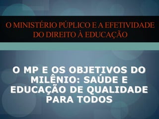 O documento discute o papel do Ministério Público no asseguramento do direito à educação de qualidade e dos Objetivos do Milênio relacionados à saúde e educação. Ele descreve um programa de acompanhamento de escolas e unidades de saúde em Itabuna para garantir o cumprimento dos direitos constitucionais à educação e saúde.