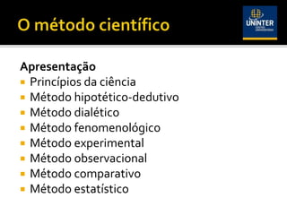 O documento discute os principais métodos científicos, incluindo o método hipotético-dedutivo, dialético, fenomenológico, experimental, observacional, comparativo e estatístico. Ele também lista os princípios gerais da ciência, como ser objetiva, racional e sistemática.