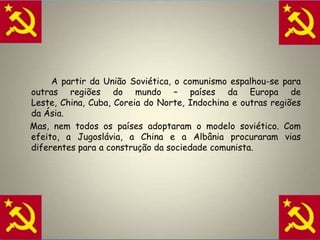 O documento descreve a expansão do comunismo após a Segunda Guerra Mundial na Europa Oriental, China e Cuba, além de experiências comunistas diferentes na Iugoslávia, China e Albânia. Também discute as propostas de líderes soviéticos como Kruschev, Brejnev e Gorbachev para reformar a economia da URSS, mas que eventualmente falharam e levaram ao colapso do modelo soviético.