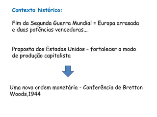 O documento discute a formação de blocos econômicos após a Segunda Guerra Mundial, incluindo a criação da Comunidade Econômica Europeia e do Mercosul. Também aborda os tipos de integração entre países e fornece exemplos de principais blocos como a União Europeia, o NAFTA e a APEC.