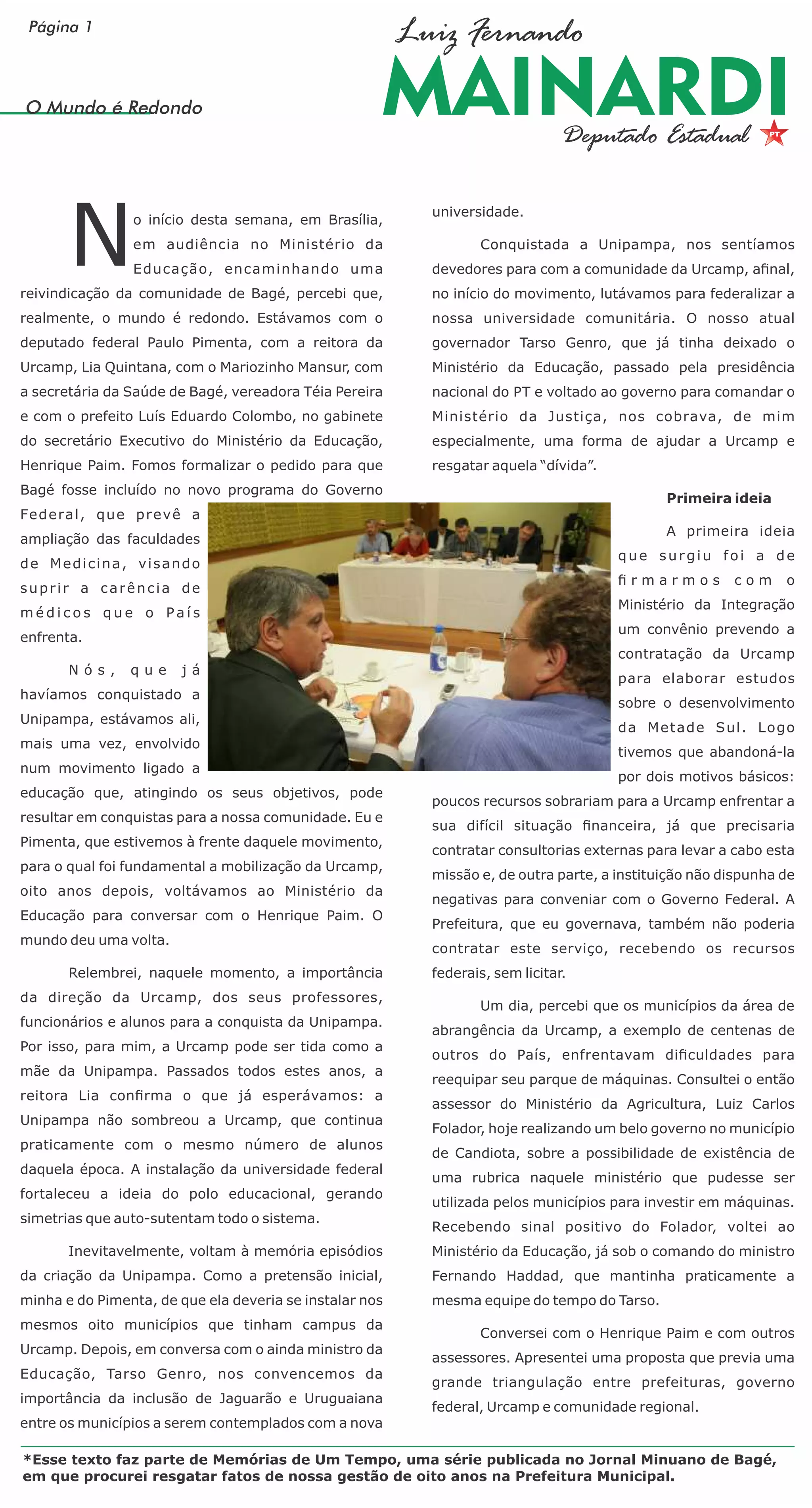 Este documento descreve como o autor ajudou a Universidade Regional da Campanha (Urcamp) ao longo dos anos por meio de vários programas governamentais. Ele também discute como ajudou a trazer uma faculdade de medicina para Bagé. Finalmente, reflete sobre como seu compromisso com a Urcamp permanece forte devido aos laços que construiu quando era estudante lá.