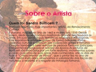 A pintura "O Nascimento de Vênus" de Sandro Botticelli retrata a deusa Vênus surgindo das águas em uma concha empurrada por Zéfiro e Clóris enquanto recebe um manto de flores de uma Hora. A obra utiliza temas mitológicos e alegorias da primavera em um estilo característico do Renascimento com cores suaves e corpos idealizados.